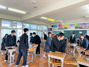 12月1日(金) 期末考査終了後、避難訓練を実施しました。今回は、「授業中6教室に設置しているストーブから出火」を想定し、生徒の避難経路、教職員の役割を確認しました。改善点は見られましたが、例年以上に実践的な訓練を実施することができ、勉強になりました。御指導いただきました宇和島消防署の皆様、ありがとうございました。